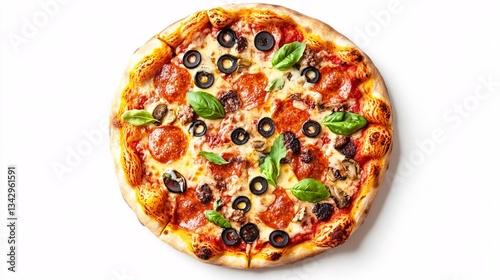 Delicious pepperoni, mushroom, and olive pizza on white background; food photography for menus