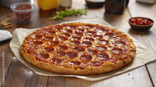 Delicious pepperoni pizza with crispy crust on wooden table
