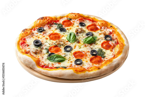 Delicious pepperoni pizza with olives and basil on wooden plate, cut out