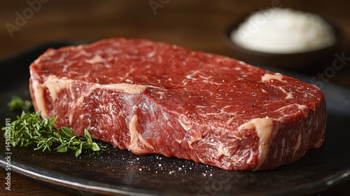 Delicious piece of grain-fed steak served on a plate with copy space available for text or branding enhancements