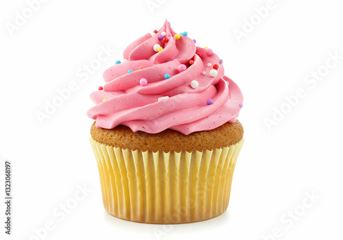 Delicious Pink Frosted Cupcake with Sprinkles on White Background