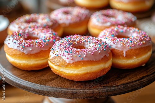 Delicious Pink Frosted Donuts Topped With Colorful Sprinkles on a Wooden Cake Stand in a Bakery Setting