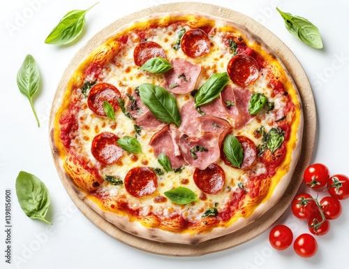 Delicious pizza topped with salami, ham, and mozzarella cheese. Fresh basil and cherry tomatoes surround the pizza on a wooden board