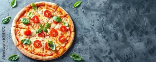 Delicious pizza with various toppings including pepperoni, tomatoes Free copy space for text., olives, and basil leaves on a grey background.