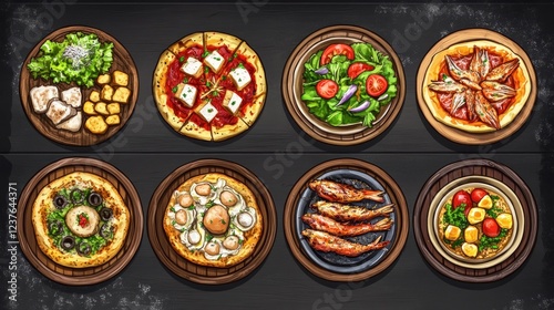 Delicious pizzas, salads, seafood, overhead view. Food menu design