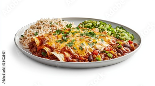 Delicious plate of enchiladas covered in red and green salsa melting cheese served for an authentic mexican dining experience