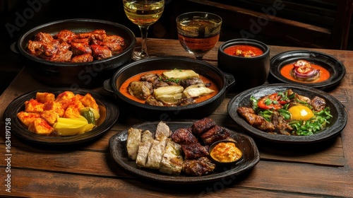 Delicious Platter of Grilled Meats and Gourmet Sides on a Wooden Table