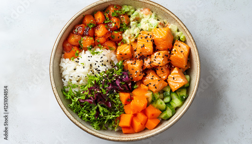 Delicious poke bowl with salmon, rice and vegetables on light grey table, top view