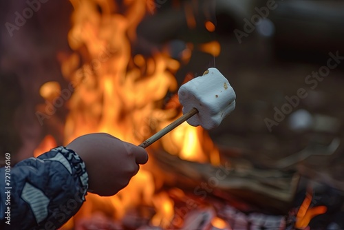 Delicious puffy marshmallows roasting over bonfire, closeup. Space for text: hand of child or adult holding skewer.