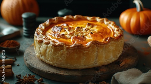 Delicious Pumpkin Pie on Rustic Wooden Board with Autumn Decor