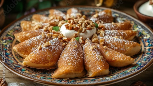 Delicious Qatayef Pancakes Served with Nuts and Cream
