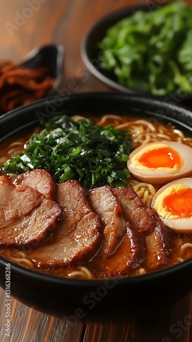 Delicious ramen bowl with chashu pork, soft boiled eggs, and greens.
