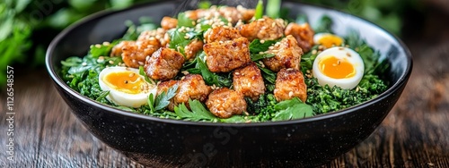 Delicious ramen bowl with eggs, meat, and vegetables, steaming hot, showcasing Japanese cuisine, food photography, and restaurant menu design.