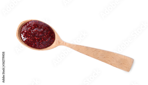 Delicious raspberry jam in wooden spoon isolated on white, top view