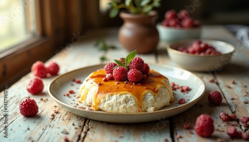 Delicious raspberry panna cotta dessert cozy kitchen food photography rustic setting close-up culinary delight