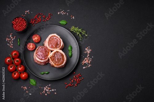 Delicious raw fresh pork or chicken meat rolls wrapped in bacon