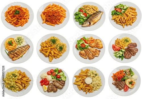 Delicious Restaurant Food Plates Variety Grilled Fish Pasta Steak Potatoes Meal Menu Meat Side Lunch