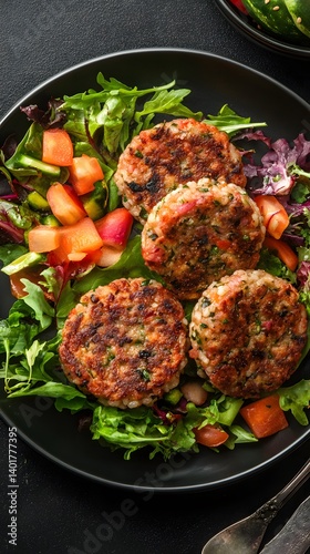 Delicious Rice Patties with Fresh Salad on Black Plate