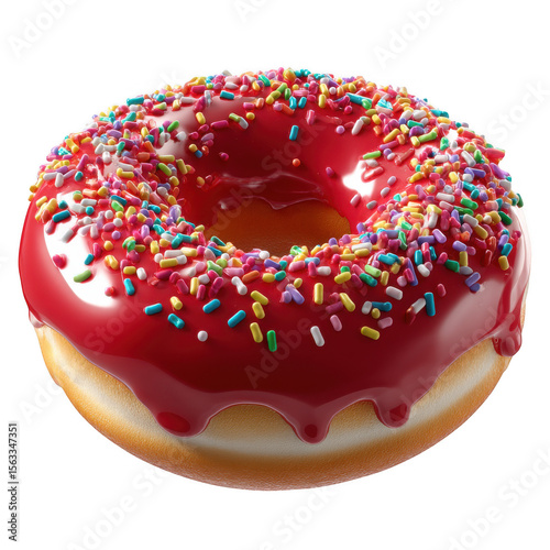 Delicious ring donut with bright red icing and colorful sprinkles isolated on a transparent background