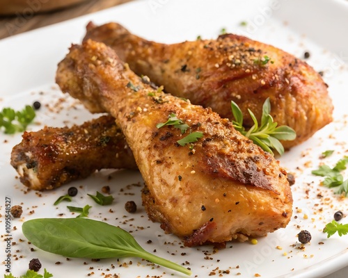 Delicious roasted chicken drumsticks garnished with fresh herbs on a white plate. Perfect for food blogs, menus, or culinary advertisements