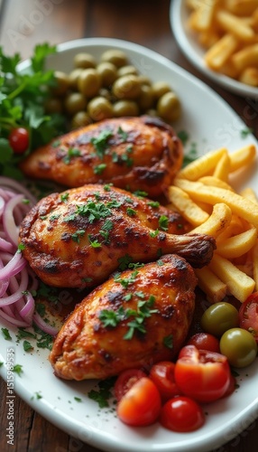 Delicious roasted chicken with fries, olives, and tomatoes indoors