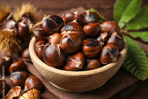 Delicious roasted edible chestnuts in wooden bowl on table, closeup