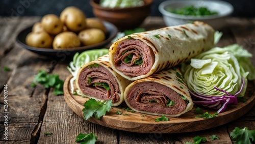 Delicious rolled flatbreads filled with meat served on wooden platter with fresh vegetables and potatoes in rustic kitchen setting Copy Space