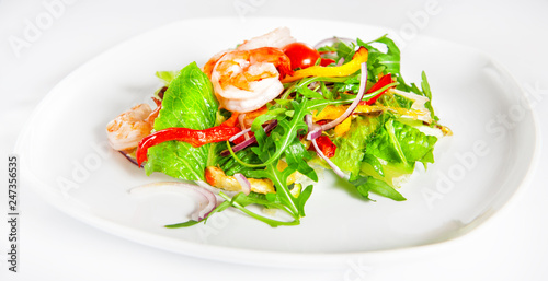 Delicious salad with shrimp, tomatoes and greenery on white