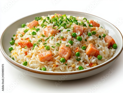 Delicious salmon fried rice with peas and scallions in a ceramic bowl on a white background