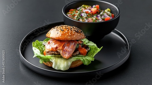 Delicious Sandwich on Black Plate Accompanied by Fresh Colorful Salad