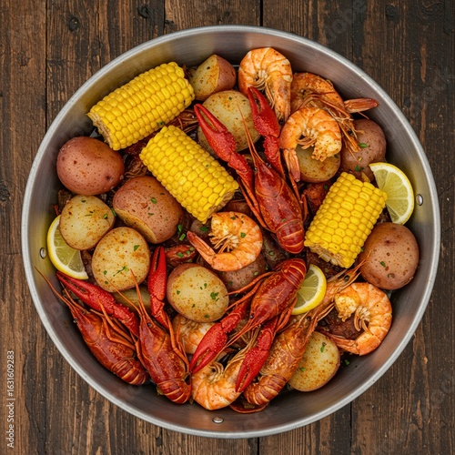 Delicious Seafood Boil: Crawfish, Shrimp, Corn, and Potatoes on Rustic Wood.