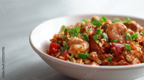 Delicious seafood fried rice in white bowl ready to eat, gourmet food