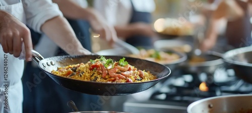 Delicious Seafood Paella Preparation in a Busy Kitchen