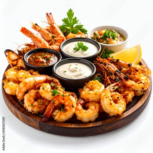 Delicious seafood platter featuring an assortment of grilled shrimp selections on white background