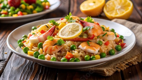 Delicious Seafood Rice Bowl: Shrimp, Fish, Peas & Corn with Lemon