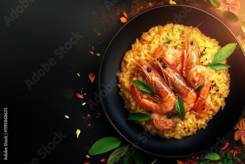 Delicious seafood risotto adorned with succulent shrimp and fresh herbs in an elegant presentation