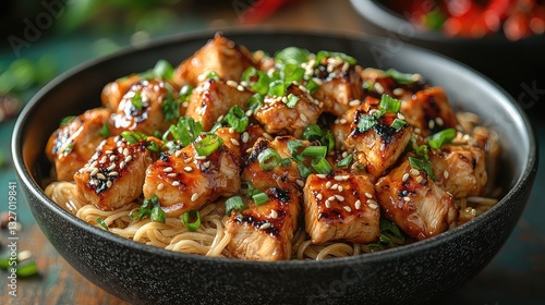 Delicious Sesame Glazed Chicken Stir-Fry with Noodles in a Dark Bowl A Close-Up Shot of a Savory Asian-Inspired Dish Featuring Tender Chicken Pieces, Glossy Sauce, and Fresh Green Onions.