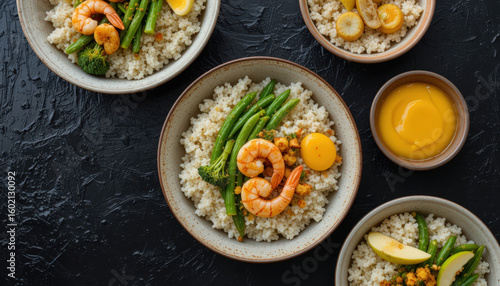 Delicious shrimp and broccoli rice bowl modern kitchen food photography minimalist setting overhead view culinary delight