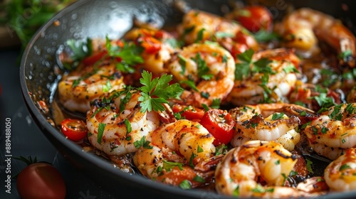 Delicious shrimp dish cooked with cherry tomatoes and garnished with fresh herbs, served in a skillet, perfect for a gourmet meal.