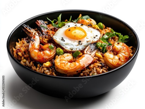 Delicious Shrimp Fried Rice Topped With a Perfectly Fried Egg in a Sleek Black Bowl Generative AI