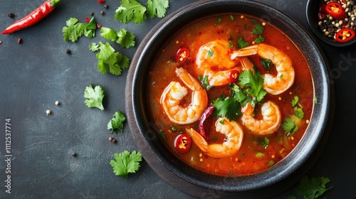 Delicious Shrimp Soup with Fresh Herbs and Spices in Rustic Bowl