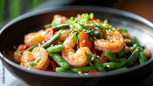 Delicious shrimp stir fry with vibrant vegetables, garnished with fresh herbs and sesame seeds, perfect for a healthy meal.
