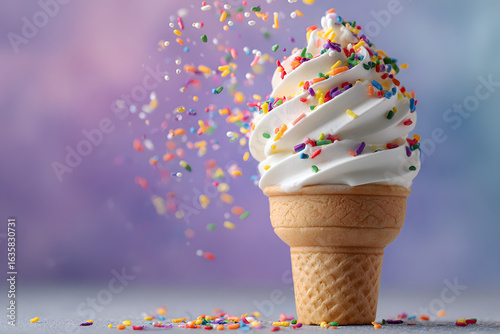 Delicious soft serve ice cream with rainbow sprinkles ready to enjoy