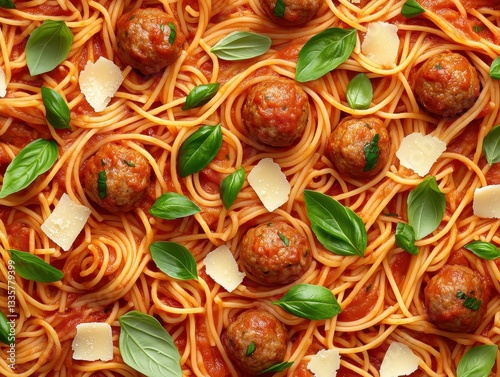 Delicious spaghetti and meatballs garnished with fresh basil and cheese