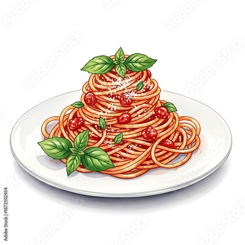 Delicious spaghetti with tomato sauce and fresh basil garnished on a white plate