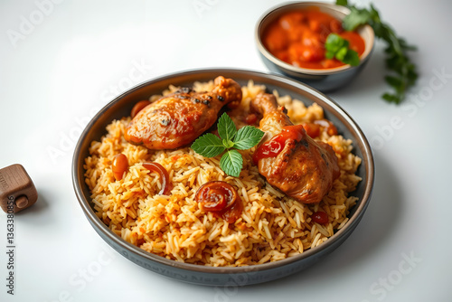Delicious Spicy Chicken Biryani with Red Sauce in Black Bowl – Traditional Indian Cuisine