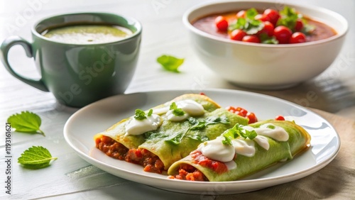 Delicious Spinach Crepes with Savory Filling and Creamy Topping, Served with a Side of Tomato Soup and Herbal Tea
