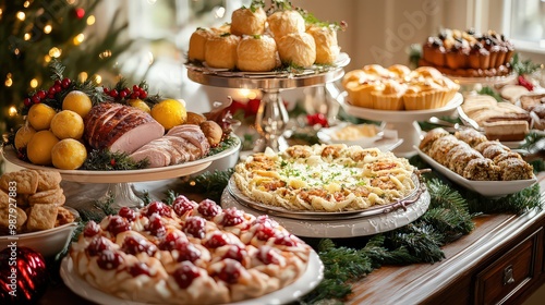 delicious spread of Christmas treats including pies, pastries, ham, and fruit, set on a festive table with seasonal decor.