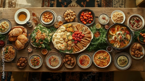 Delicious spread of traditional Middle Eastern dishes served at a family gathering on a rustic wooden table