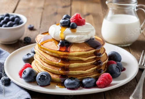 Delicious Stack of Pancakes with Berries and Whipped Cream, Drizzled with Maple Syrup